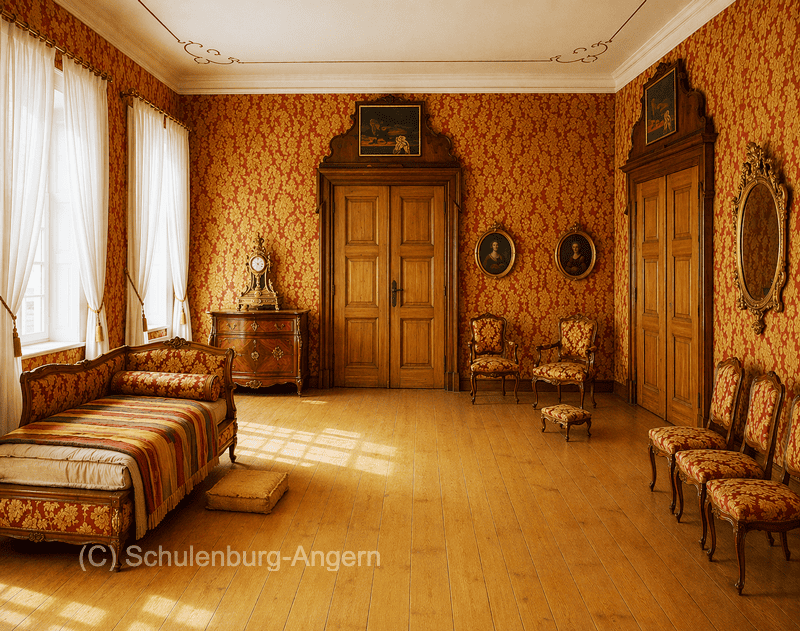 Die Antichambre vor Seiner Exzellenz Zimmer – gelegen zwischen dem Vestibül und dem persönlichen Appartement Christoph Daniel von der Schulenburg – erfüllte um 1743 eine zentrale vermittelnde Funktion innerhalb der barocken Raumstruktur. Als Schwellenraum zwischen öffentlichem Eingangsbereich und privatem Rückzugsort diente sie sowohl dem Empfang von Besuchern als auch dem Übergang in die Appartements des Hausherrn. Ihre hochwertige Ausstattung mit gelb-roten Brocadell-Tapeten, einer kunstvollen Pendule, weißen Leinwandgardinen und großformatigen Supraporten mit Bacchanal-Darstellungen verleiht dem Raum eine repräsentative, zugleich jedoch wohnlich-intime Atmosphäre. Die integrierte Schlafbank mit gestreifter Wolldecke, Strohsack und Matratze deutet auf eine sekundäre Wohnfunktion hin, wie sie für Antichambres in adligen Häusern nicht untypisch war: als kurzfristige Schlafgelegenheit für Bedienstete, Leibdiener oder reisende Angehörige. In ihrer Mehrfunktionalität verband die Antichambre Repräsentation, Ruhe, Übergang und soziale Hierarchisierung auf engstem Raum – ein typisches Charakteristikum barocker Raumdramaturgie.